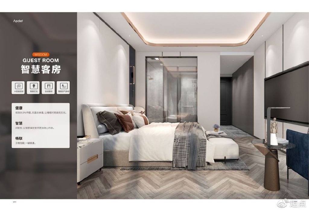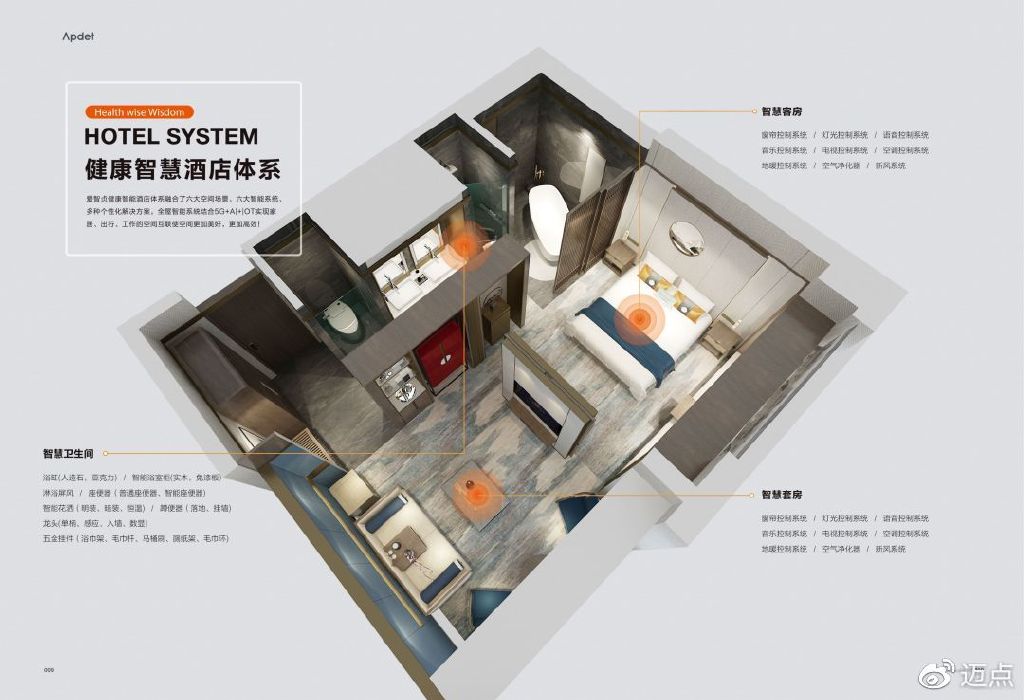 如锦江、温德姆、华住、金陵、东呈、富力、尊茂、白天鹅、雷迪森、凤悦等大型酒店集团就与爱智贞合作,利用爱智贞打造的健康智能酒店体系,融合了六大空间场景、六大智能系统、多种个性化解决方案、全屋智能系统结合5G+AI+LOT实现家居、出行、工作的空间互联使空间更加美好和高效。